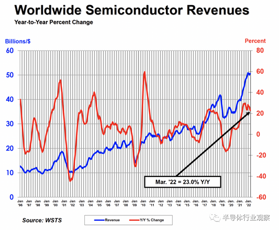 半導(dǎo)體行業(yè)協(xié)會 (SIA) 統(tǒng)計數(shù)據(jù)顯示,2022年第一季度全球半導(dǎo)體銷售額達(dá)到 1517億美元,較去年同期增長23%。但比2021年第四季度低0.5% 。2022年3月全球銷售額為506億美元,環(huán)比增長1.1%。